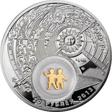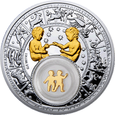 | Качество | пруф, со вставкой (прозрачная капсула с находящимся в ней подвижным серебряным с позолотой филигранным элементом в виде детей-близнецов) |
