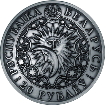 Аверс: вверху − рельефное изображение Государственного герба Республики Беларусь; в центре монет – изображение фрагмента гравюры, на которой изображено Солнце, Луна и звезды; справа – проба сплава; по кругу надписи: вверху – РЭСПУБЛIКА БЕЛАРУСЬ, внизу – номинал 20 РУБЛЁЎ (на серебряных) и 1 РУБЕЛЬ (на медно-никелевых) и год чеканки.